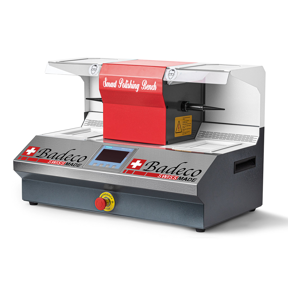 Herzstück des Geräts ist ein leistungsstarker, vibrationsfreier Motor mit bis zu 4500 U/min. Die Steuerung erfolgt komfortabel über das Siemens Simatic HMI Touchpanel. Drei Sicherheitsstufen – darunter ein doppeltes Fußpedal, eine magnetgesicherte Schutzhaube und ein Not-Aus-Schalter – sorgen für höchsten Arbeitsschutz. Die integrierte Hochleistungsabsaugung mit Danfoss-Pumpen und zwei Filtern garantiert eine stets saubere Umgebung.