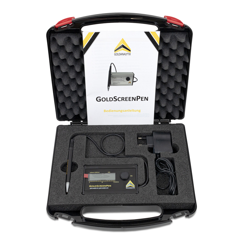 Wenn Sie zerstörungsfreie und tief durchdringende Echtheitsprüfung von Edelmetallen wie Gold, Silber, Platin oder Palladium benötigen, ist der Goldanalytix GoldScreenPen genau das richtige Goldprüfgerät. Der GoldScreenPen ist sehr vielseitig einsetzbar - egal ob im Pfandleihgeschäft, in Scheideanstalten, Münzhandelsgeschäften und auch in Recycling- und Entsorgungsbetrieben, der GoldScreenPen ist das Werkzeug der Wahl. Erhalten Sie Aussagen zur Materialbeschaffenheit über den Leitwert des Objekts in Echtzeit. Der bequem tragbare GoldScreenPen bietet alle Funktionen, die für die schnelle und sichere Prüfung von wertvollen Metallen benötigt werden.