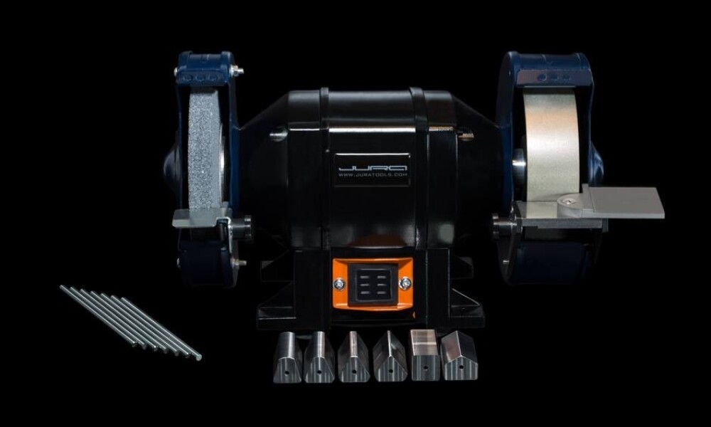 Das Juratools Sharpening System Complete ermöglicht ein schnelles und einfaches Schärfen der Stichel. Mit dem Vorrichtungsset lassen sich Stichelformen auf der Tischschleifmaschine schnell ausarbeiten. Die Templates/ Schleifvorlagen unterstützen Sticheleinsätze mit 3/32" (2,35 mm) und 1/8" (3,17 mm).