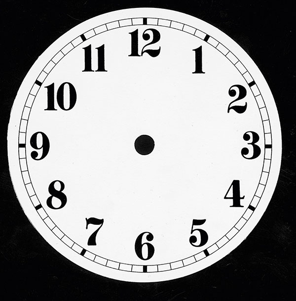 weißes Zifferblatt mit aufgedruckten schwarzen Zahlen ( 1 - 12 )